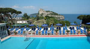 Здание отеля Parco Cartaromana прекрасно вписывается в пейзаж с зелеными холмами острова Искья. Из отеля открывается прекрасный вид на Арагонский замок и бухту Картаромана.